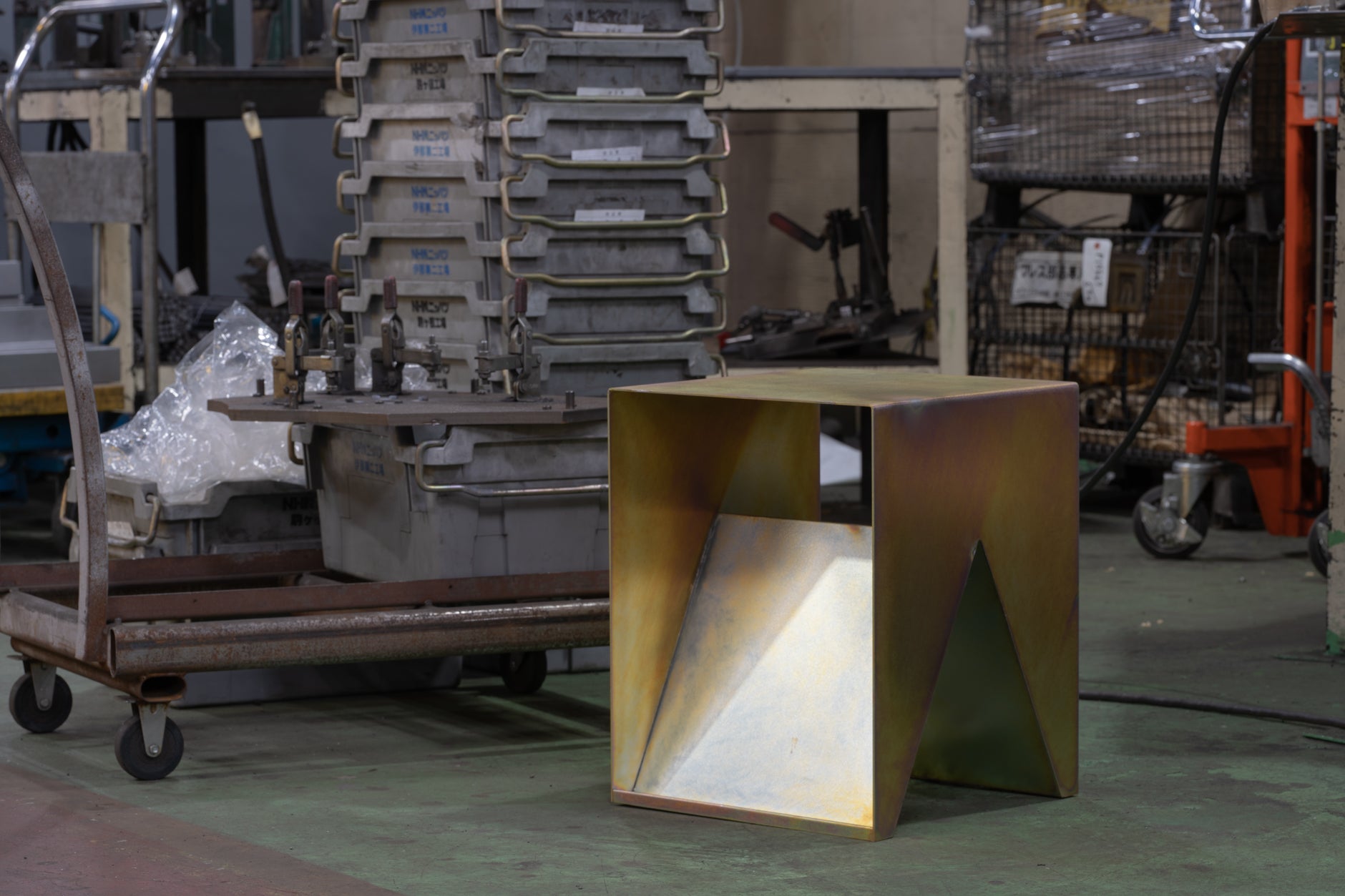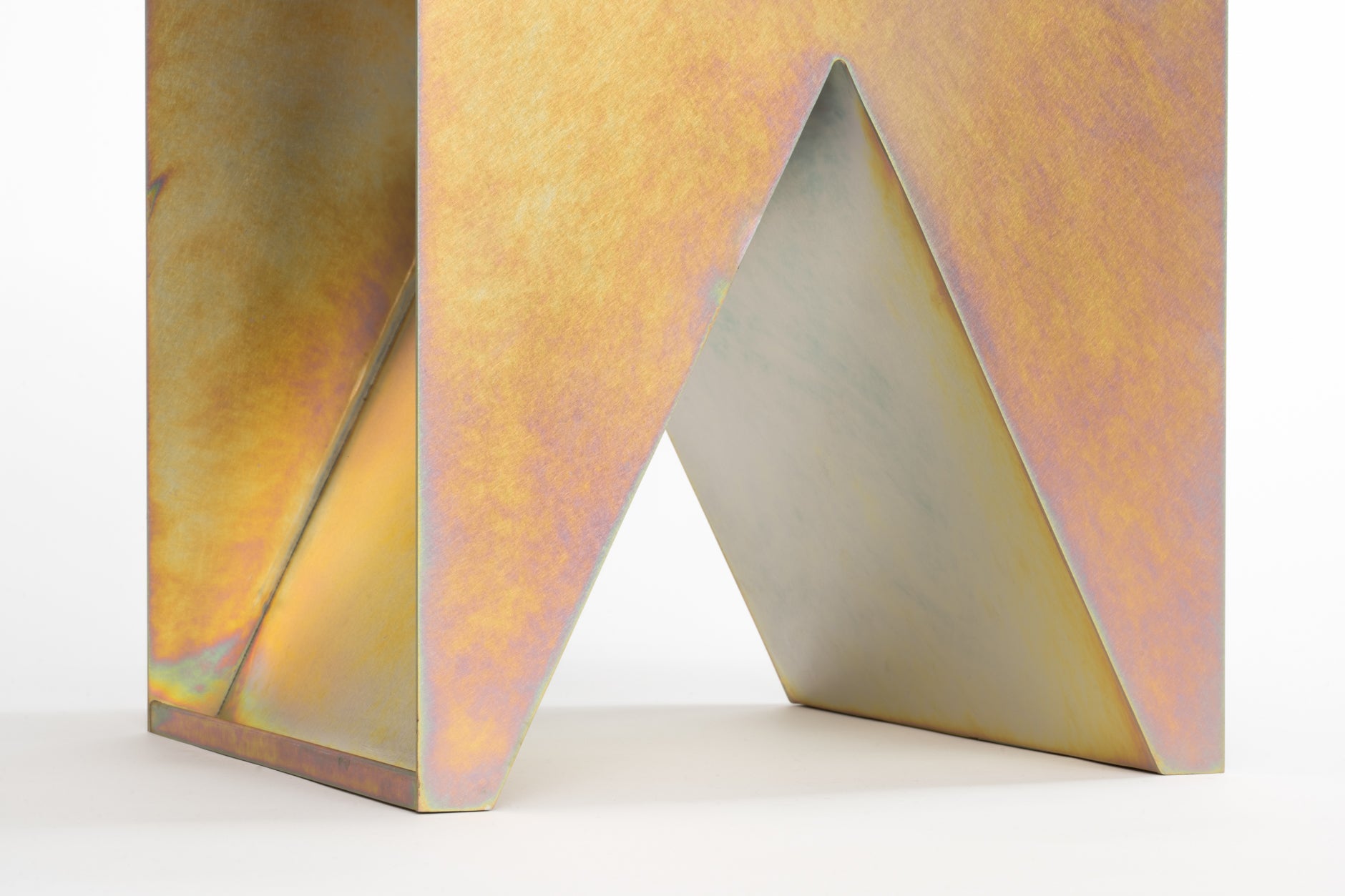 四角形と三角形の単純図形の組み合わせによるミニマムなサイドテーブル。要素を削ぎ落としたシンプルな形状でありながら、見る角度によって印象を変えます。お尻は冷んやりしますが、スツールとしても使用が可能。
